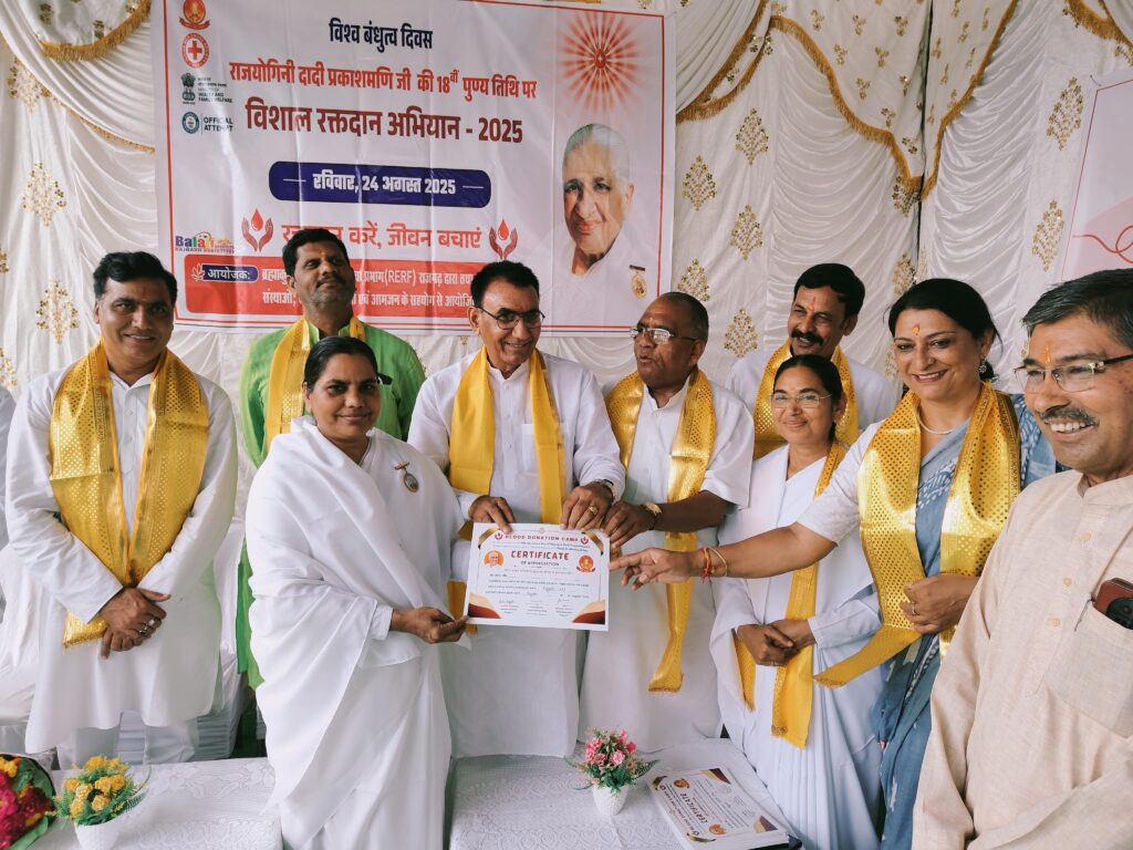 प्रजापिता ब्रह्माकुमारी ईश्वरीय विश्व विद्यालय राजगढ़ एवं समाज सेवा प्रभाग की ओर से संस्था की पूर्व मुख्य प्रशासिका आदरणीय राजयोगिनी डॉ. दादी प्रकाशमणि जी की 18वीं पुण्यतिथि को विश्व बंधुत्व दिवस के रूप में मनाया गया। कार्यक्रम का शुभारंभ दीप प्रज्वलित कर एवं दादी जी को पुष्प अर्पित कर किया गया । इस अवसर पर राज्य मंत्री नारायण सिंह पंवार, विधायक अमर सिंह यादव, जिला पंचायत अध्यक्ष चंदरसिंह सोंधिया, अपर कलेक्टर शिव प्रसाद मणराह, पूर्व विधायक रघुनंदन शर्मा, ब्रह्माकुमारी के जिला प्रभारी ब्रह्माकुमारी मधु दीदी, एडिशनल एसपी के.एल. बंजारे एवं पुलिस फोर्स, जनपद अध्यक्ष फूल सिंह तंवर, मुख्य चिकित्सा एवं स्वास्थ्य अधिकारी डॉक्टर शोभा पाटिल, सिविल सर्जन डॉक्टर नितिन पटेल, नगर अध्यक्ष विनोद साहू, पूर्व विधायक हेमराज कल्पौनी, जिला कांग्रेस महामंत्री राशीद जमील, पूर्व विधायक प्रतापसिंह मंडलोई, भाजपा प्रदेश कार्यकारिणी सदस्य मोना सुस्तानी, रिटायर्ड एसडीओ एवं समाजसेवी प्रताप सिंह सिसोदिया उपस्थित रहे। बीके मधु दीदी ने दादी जी के सेवामय जीवन को स्मरण करते हुए कहा कि “दादी जी ने सदैव विश्व शांति, प्रेम और सहयोग का संदेश दिया।” दादी प्रकाशमणि जी का सम्पूर्ण जीवन शांति, प्रेम और भाईचारे को समर्पित था। उन्होंने यह सिखाया कि जाति, धर्म, भाषा या संस्कृति चाहे कोई भी हो, हम सब आत्माएँ परमात्मा की संतान हैं। इस दृष्टि से हम सभी में आपसी बंधुत्व और सहयोग की भावना जाग्रत होनी चाहिए। दादी जी का सपना था कि हर मनुष्य अपने भीतर की दिव्यता को पहचाने और “वसुधैव कुटुम्बकम्” की भावना के साथ जीए। इस अवसर पर राज्य मंत्री नारायण सिंह पंवार ने ब्रह्माकुमारी संस्था की प्रशंसा करते हुए एवं दादी को श्रद्धांजलि देते हुए कहा कि दादी एक ऐसी शख्सियत थी जो इस संस्था को एक उच्च शिखर की ओर ले गई। उनकी सेवाओं को आज हम प्रत्यक्ष रूप में देख रहे हैं। दादी जी का समर्पण भाव एवं विश्व बंधुत्व भाव के कारण ही आज संपूर्ण भारत में एक विशाल रक्तदान महादान जैसा कार्य किया गया।